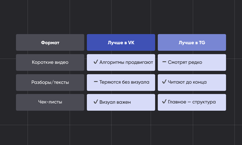 Есть и универсальные форматы, которые одинаково хорошо работают в обеих соцсетях. Это опросы, которые запускают диалог; чек-листы, которые сохраняют «на потом»; и простые посты с фото и коротким пояснением. Разница только в подаче: в VK важно добавить дизайн и сделать пост визуально ярким, в Telegram достаточно аккуратно оформить текст и дать ссылку или комментарий.