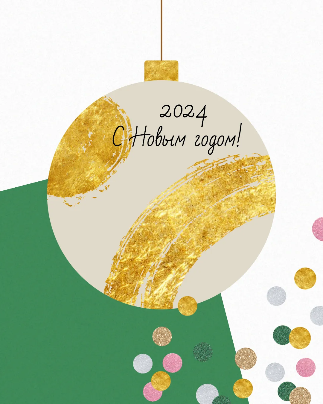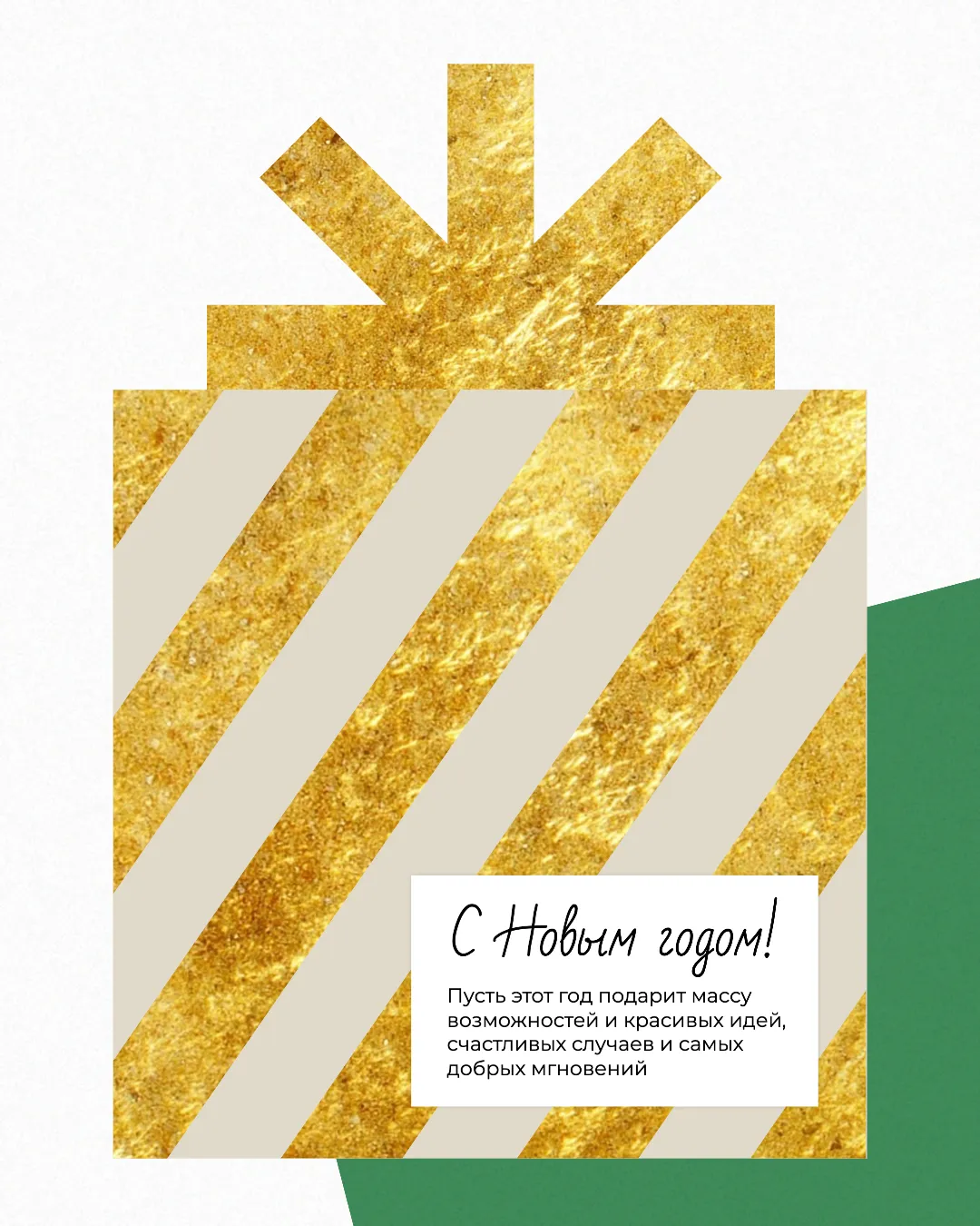 Изображение — это новогодняя открытка, украшенная стилизованным золотым подарком с бантом на верху. Бант выполнен из золотых полос, переливающихся и блестящих, словно настоящее золото. На белом фоне бант выделяется и привлекает внимание, а надпись "С Новым годом!" дополняет праздничное настроение. Открытка вдохновляет на создание подарков, оформленных с теплом и оригинальностью.