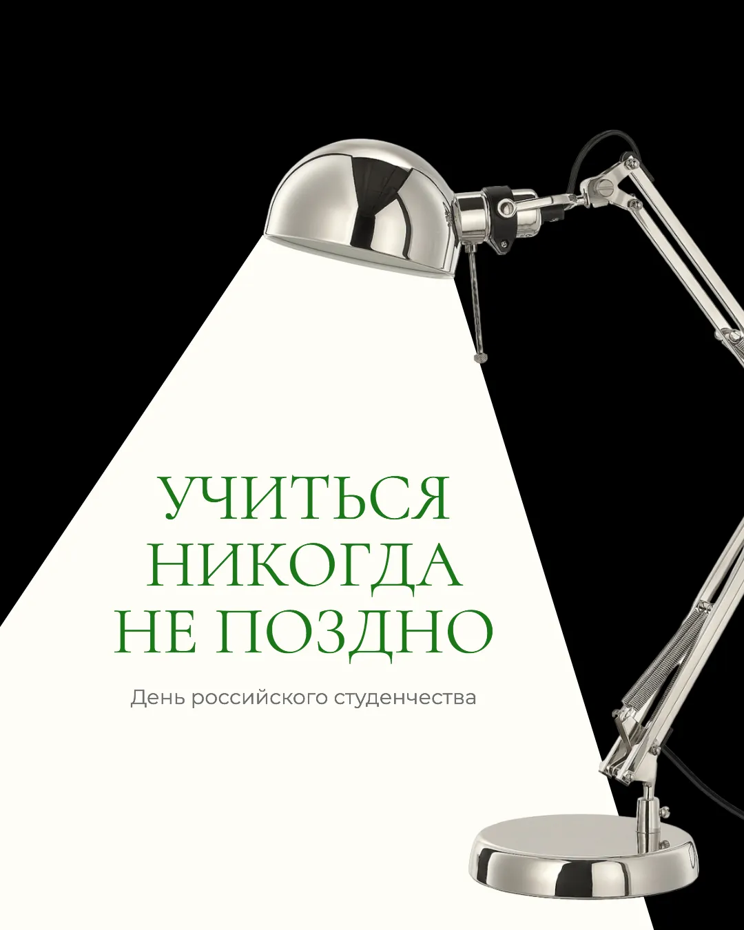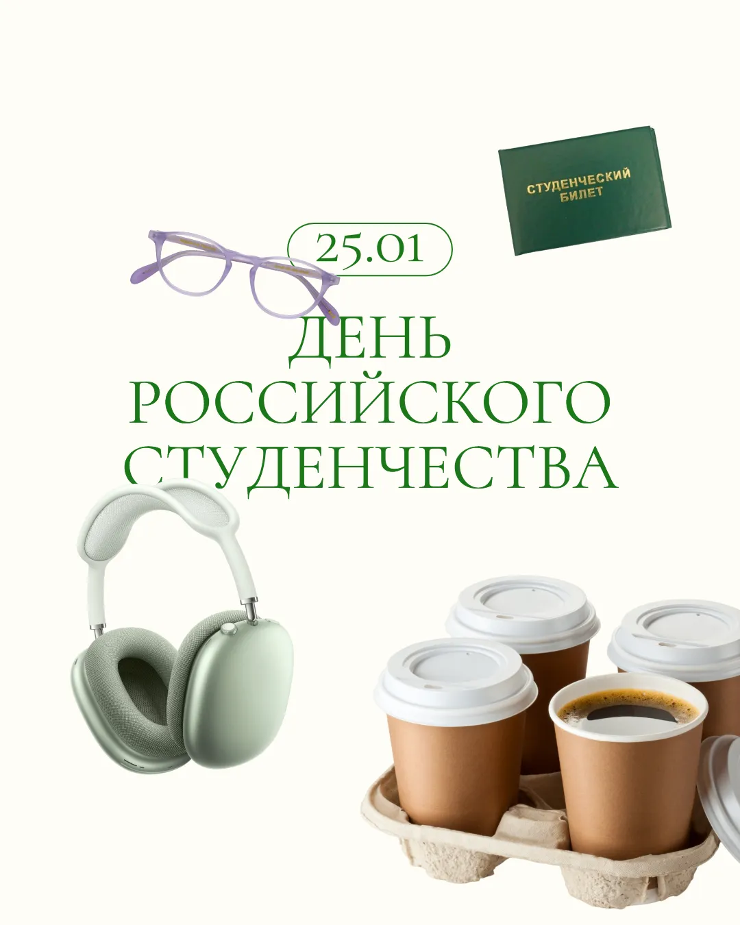Изображение служит афишей для празднования Дня Российского Студенчества, отражая атмосферу студенческой жизни. На нём изображены предметы, характерные для студента: окуляры, студенческий билет, наушники и кофе на вынос. Всё это размещено на светлом фоне, подчеркивая легкость и приятную ненавязчивость момента. Большими буквами выделена дата "25.01" и надпись "ДЕНЬ РОССИЙСКОГО СТУДЕНЧЕСТВА", что делает информацию ясной и заметной.