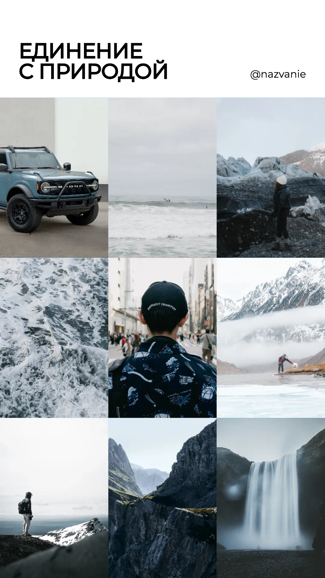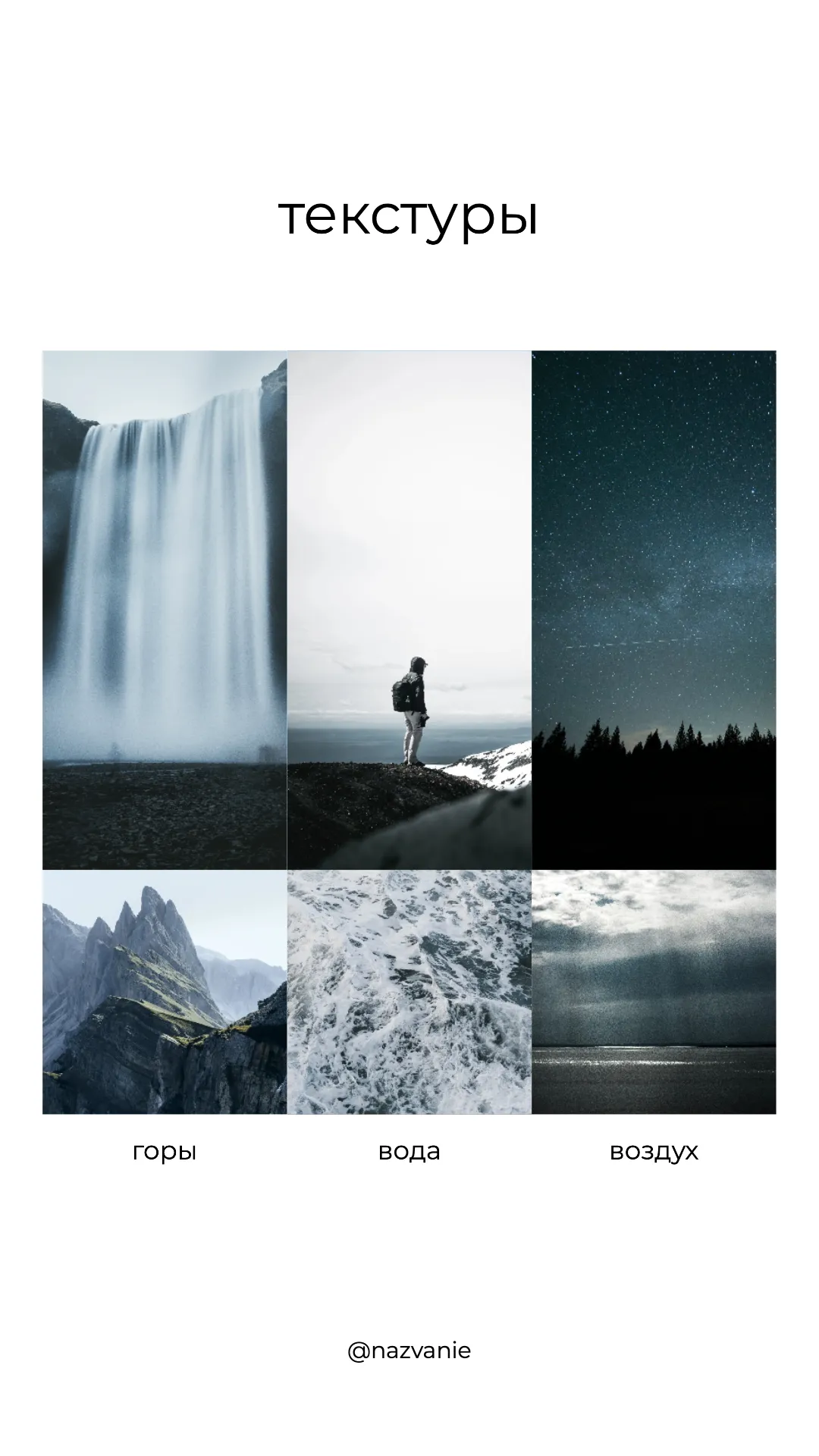 Это изображение представляет собой коллекцию фотографий, объединенных темой текстур природы. В центре изображены различные природные элементы: горы, вода и воздух. Вверху надпись "текстуры", а внизу подписано "@nazvanie". Каждая фотография отображает уникальную текстуру: водопад, горный хребет, морские волны, звёздное небо, облака и другие природные элементы. Дизайн выполнен в спокойных тонах, создавая ощущение гармонии с природой.
