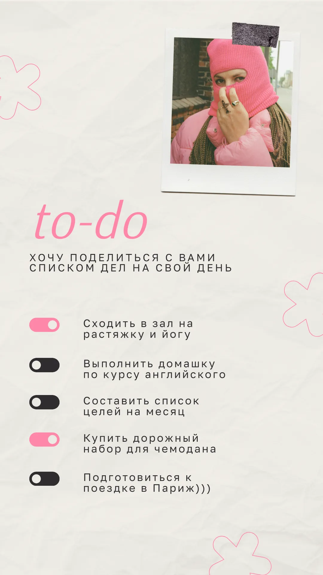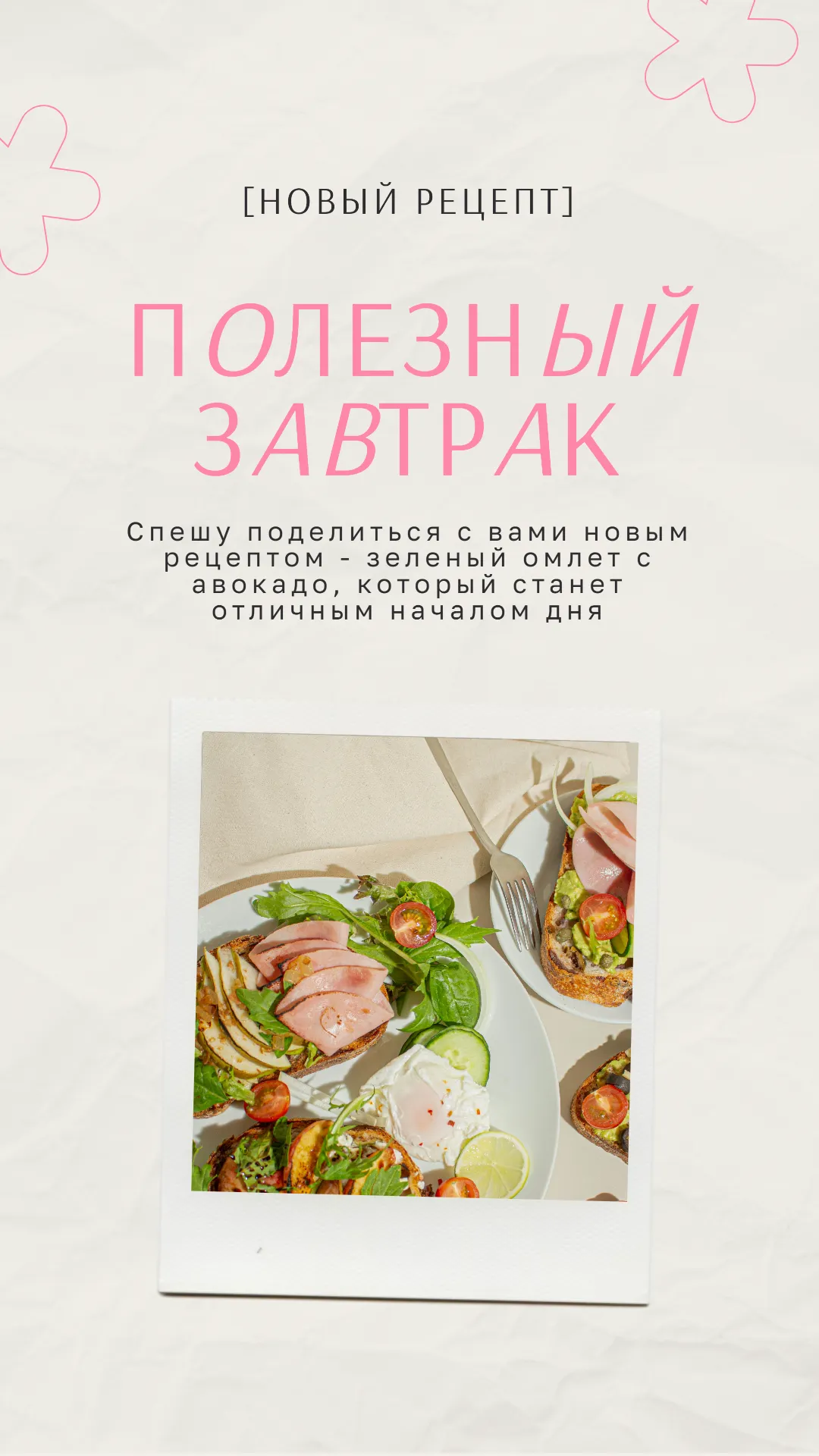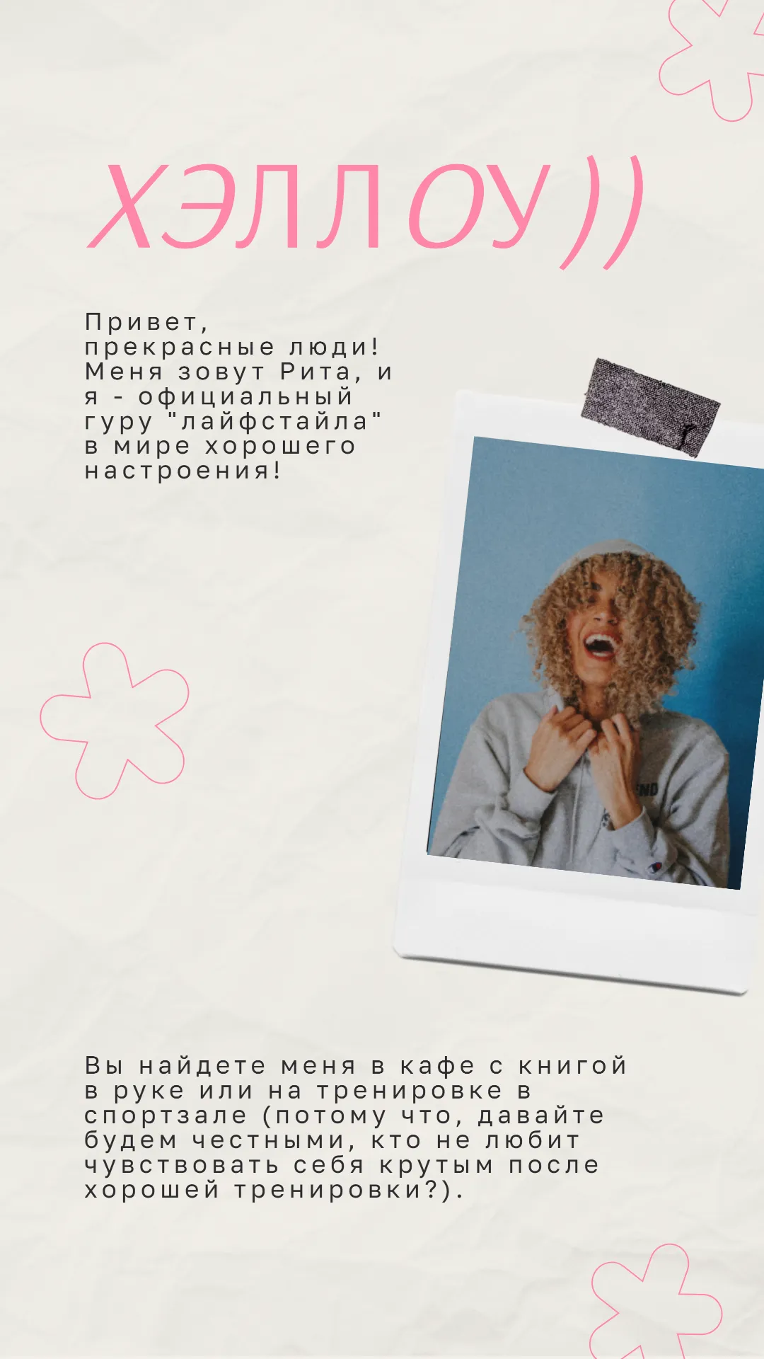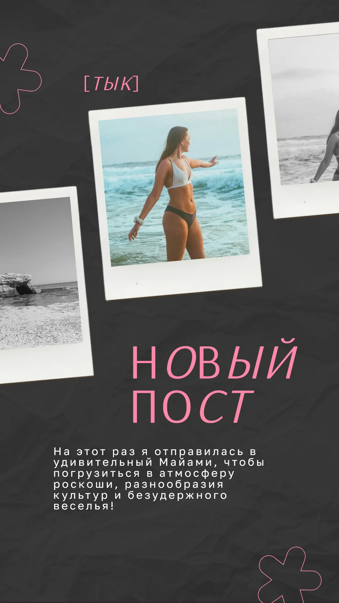 На изображении представлено объявление с двумя новостями. В верхней части изображена девушка на спортивной площадке, сопровождаемая надписью "Новость №1. Вернулась к спорту спустя 2 года". В нижней части изображение группы людей в учебном классе с текстом "Новость №2. Совсем скоро я еду в Москву на курсы". Фон объявления выполнен в темных тонах с розовыми цветочками, придающими изображению стиль и динамику.