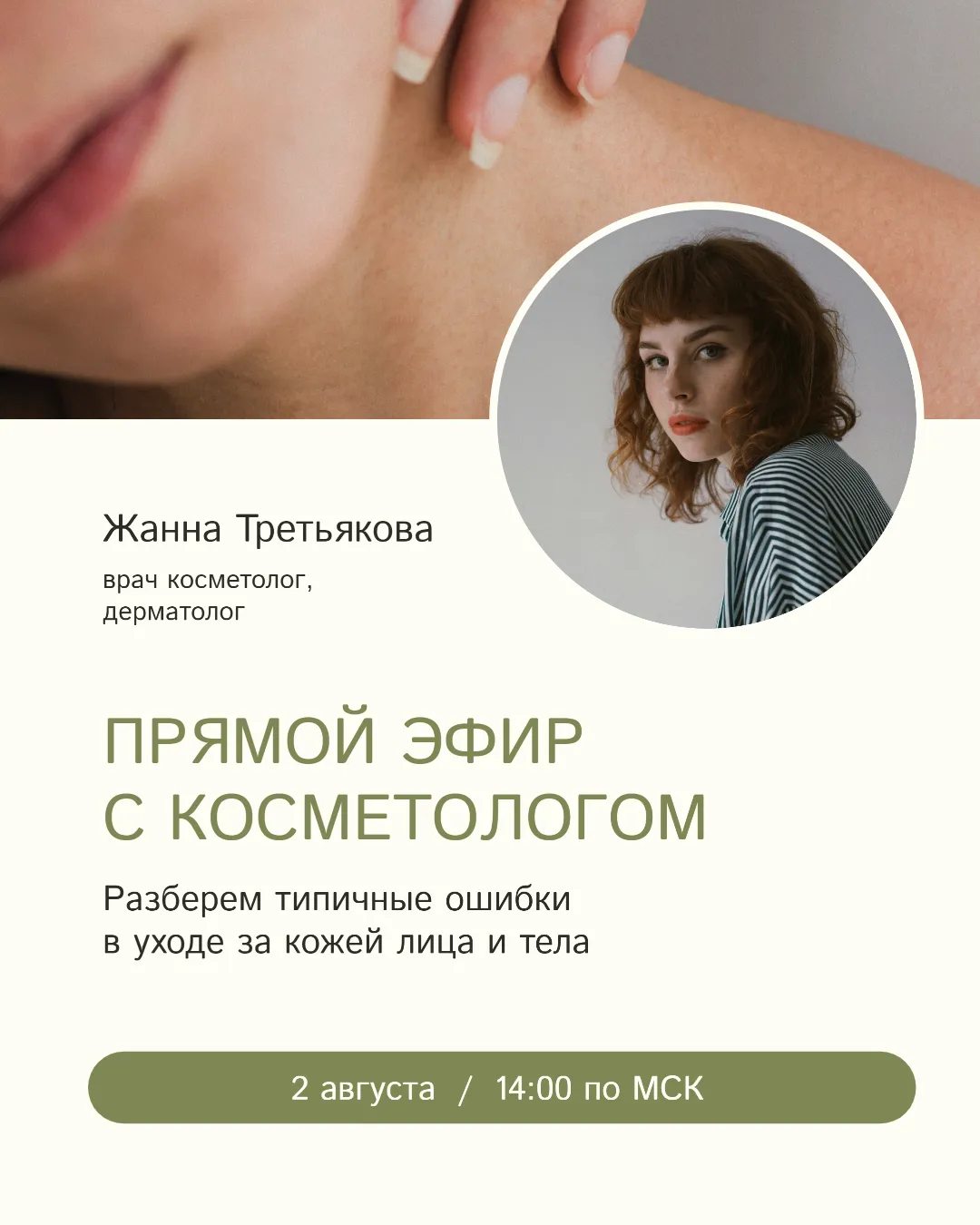На изображении представлено приглашение на прямой эфир с косметологом Жанной Третьяковой, который состоится 2 августа в 14:00 по московскому времени. На переднем плане изображение молодой женщины с красивой кожей и фотография Жанны, специалиста по уходу за кожей. Тема эфира — разбор типичных ошибок в уходе за кожей лица и тела. В нижней части изображения указаны дата и время проведения. Дизайн выполнен в мягких, успокаивающих тонах, что подчеркивает профессиональный подход к теме ухода за кожей.