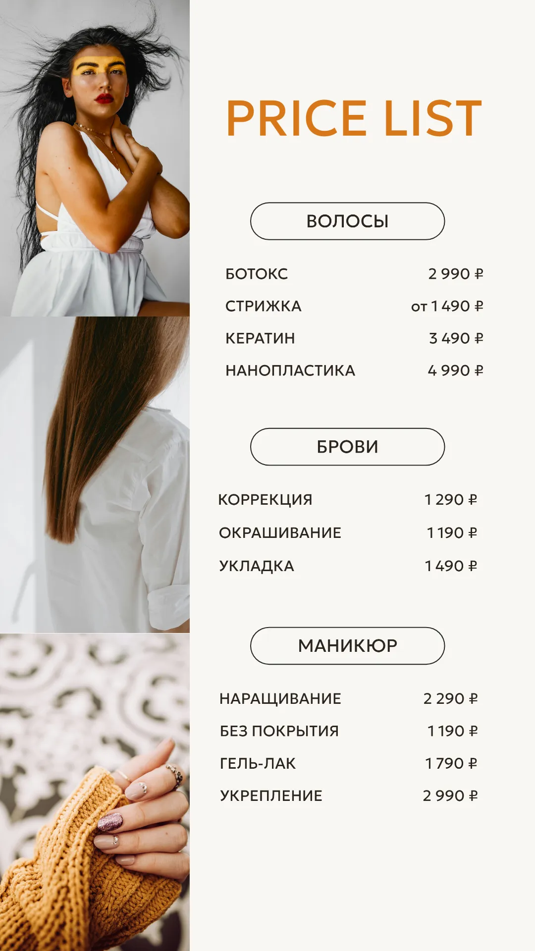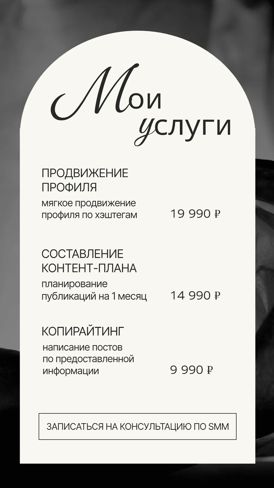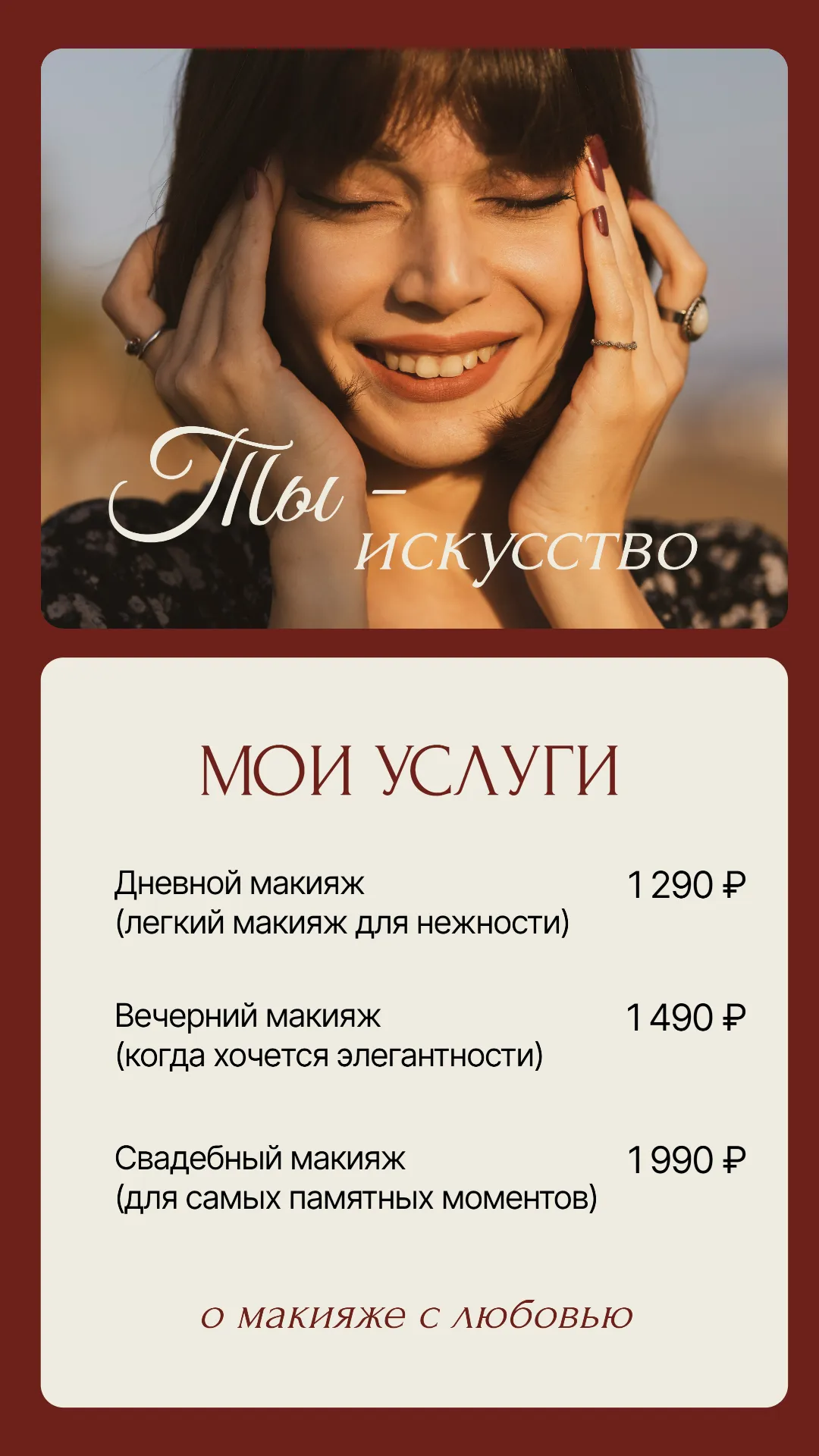 На изображении рекламируется перечень услуг визажиста. Верхняя часть баннера украшена фотографией улыбающейся девушки с надписью "Ты — искусство", что подчеркивает индивидуальный подход к клиентам. В нижней части представлены три основных услуги: дневной макияж за 1290 рублей (легкий и нежный), вечерний макияж за 1490 рублей (элегантный и выразительный) и свадебный макияж за 1990 рублей (для самых памятных моментов). Низ изображения завершает фраза "о макияже с любовью".